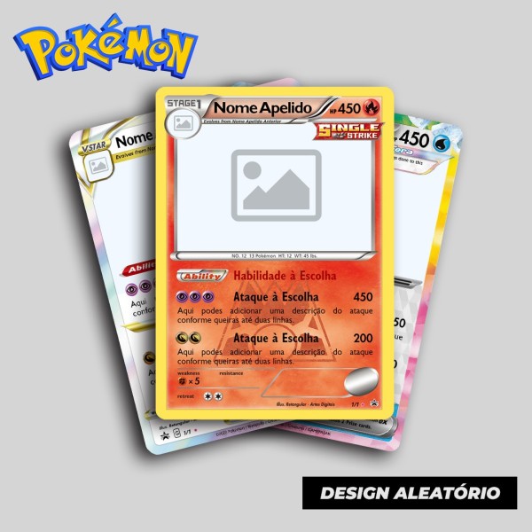 Crie a sua própria coleção com as nossas Cartas Pokémon Personalizadas! Um presente perfeito para fãs da franquia ou para quem quer dar um toque pessoal às suas batalhas de Pokémon.