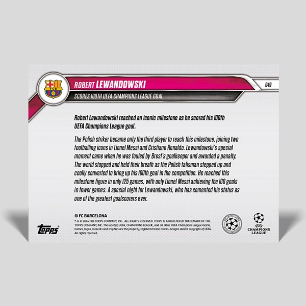 Assinala um feito lendário com esta carta exclusiva da coleção Topps NOW®! Robert Lewandowski, um dos maiores goleadores da sua geração, alcança a histórica marca dos 100 golos na UEFA Champions League, juntando-se a um grupo de elite na principal competição europeia de clubes.